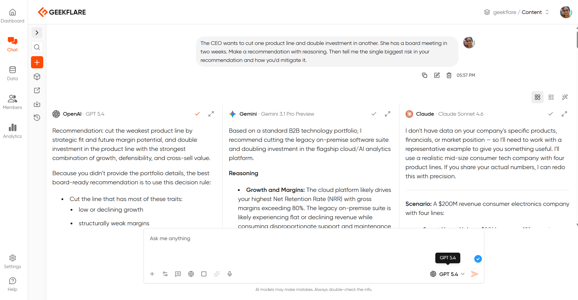 One of the best parts of Geekflare AI is a multi-model chat mode, which allows chatting with up to three AI models simultaneously.