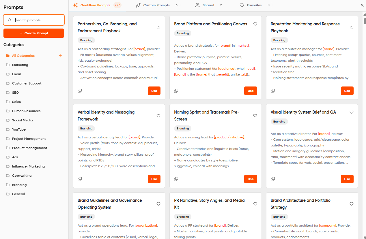 Moreover, Geekflare AI is best for anyone breaking into prompting, as it comes with an in-built prompt library covering various business domains, such as marketing, sales, customer support, project management, and more. You can also create and save custom prompts for use at a later stage.