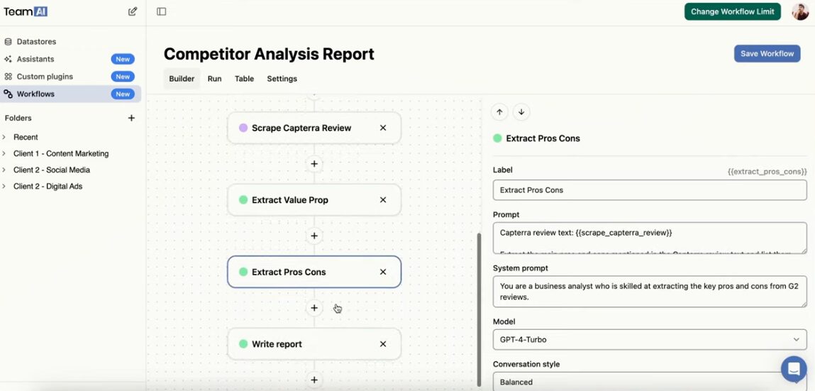 TeamAI Workflows is another feature that sets it apart from its competition. This comes with a visual editor to connect a sequence of steps, which can include chatting, web searching, data scraping, or using any custom plugin. It’s advanced yet simple to set up, with plenty of configurations for building the next level of AI agents.