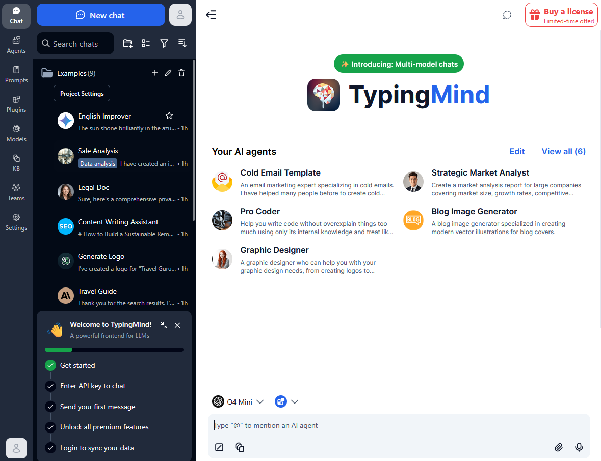 TypingMind has recently introduced its Teams version. This provides admins with data about token spend, total messages, top used AI agents in a time frame, regulate access, analytics, etc. Teams plan also comes with additional features, such as 50 pre-built AI specialty agents, API connectivity for real-time data, prompt chaining calling multiple agents, SSO, and security compliance (ex., GDPR, SOC 2 Type II, and HIPAA).