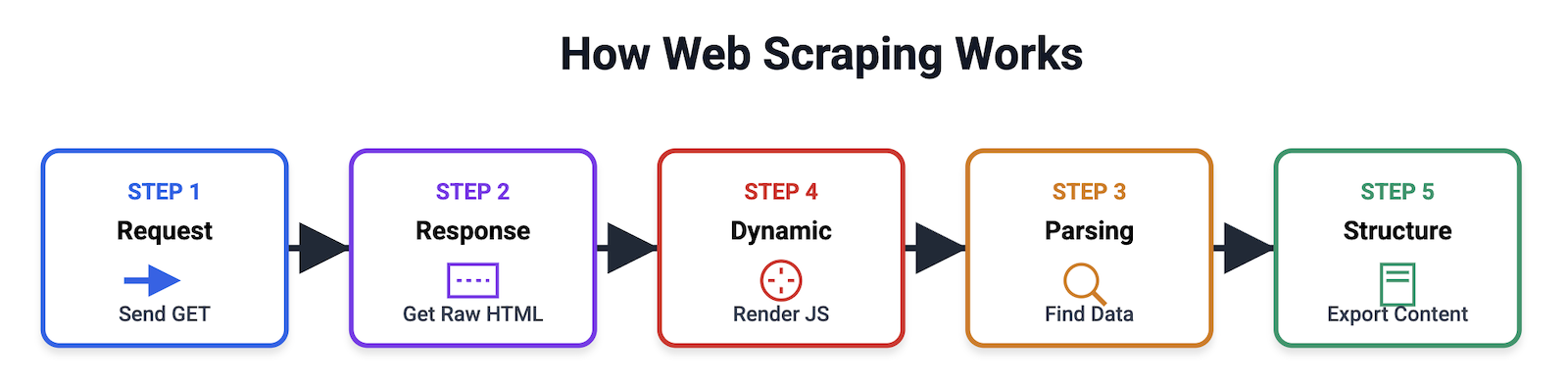 The web scraping process usually follows these five main stages: