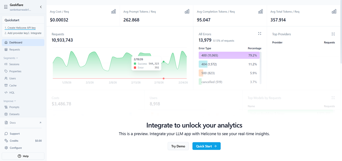 I like how Helicone automatically logs every request and shows metrics like cost, latency, and errors in one dashboard. This makes it much easier to debug issues and optimize spending.