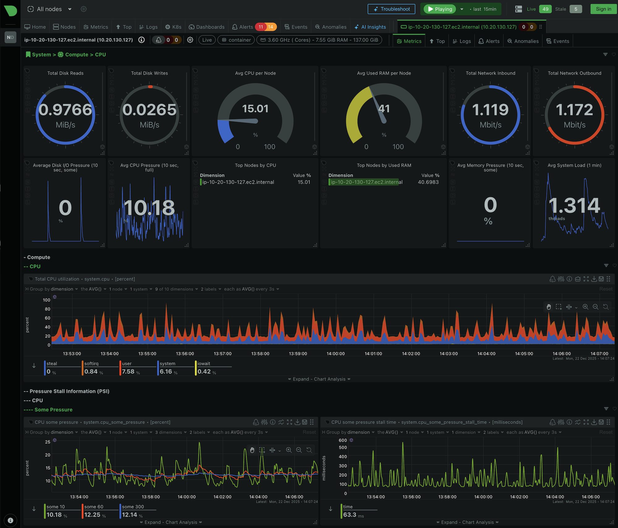 While most tools like CloudWatch provide metrics with a 1-minute or 5-minute delay, Netdata provides per-second granularity.