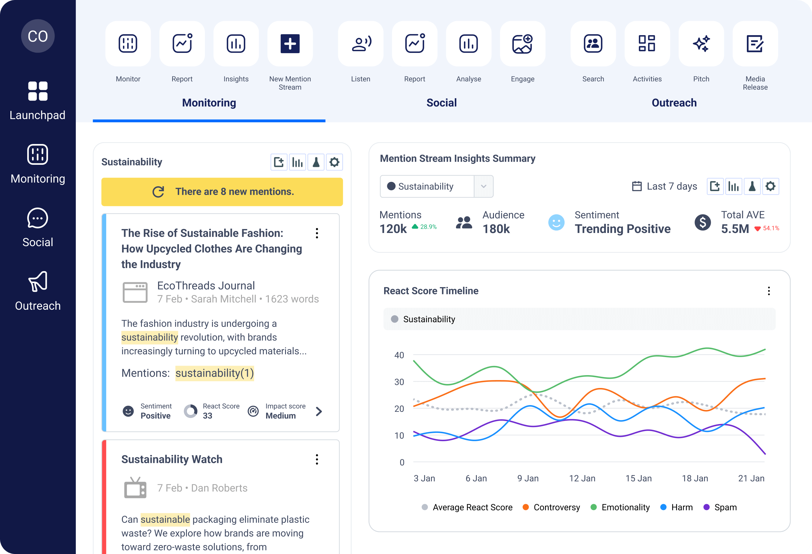 The key difference between media monitoring and brand monitoring is the focus. In media monitoring, the focus is on PR coverage, where the tool tracks news articles, press mentions, and broadcast media. Media monitoring tools are primarily used by PR teams to measure media visibility and press impact, and stay proactive when it comes to negative news related to the company.