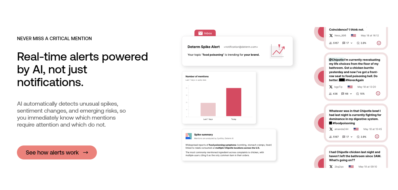 It is fast and uses AI and contextual understanding to report spikes, leading to faster average crisis response time. Determ also monitors the net sentiment spike and provides proactive alert features.