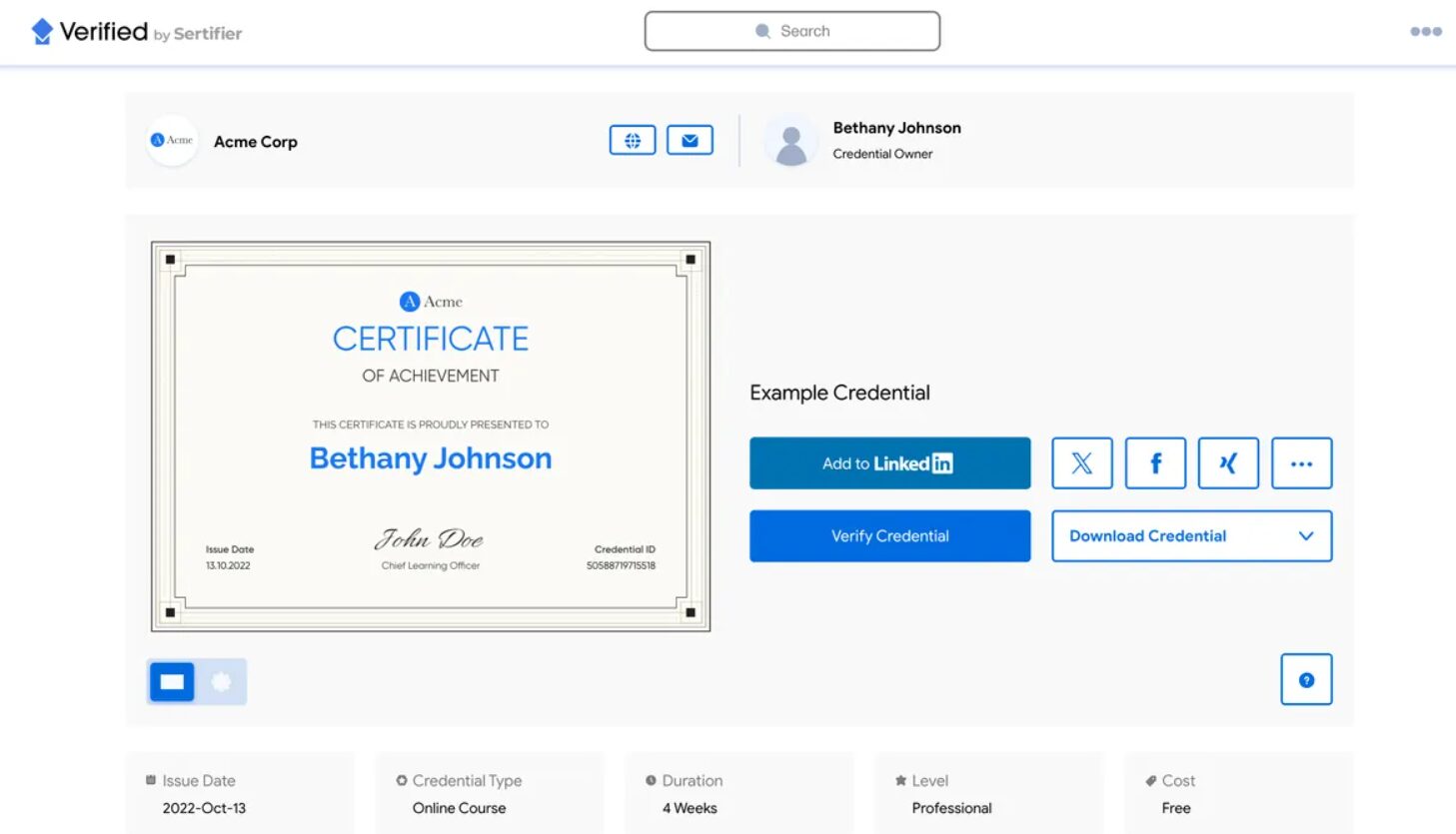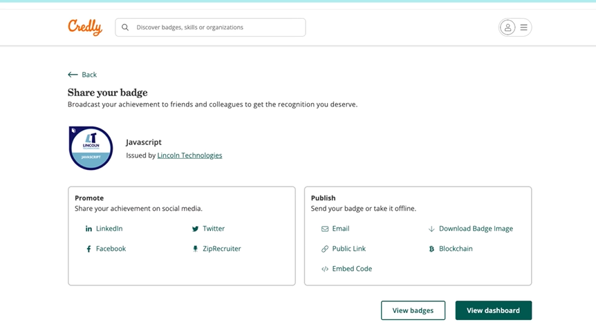 Each digital badge on Credly comes with rich details that make it easy to verify and share. The platform also offers user-friendly tools for managing credentials, tracking them, and monitoring the real impact of your program. The credentials are now also stored on blockchain to ensure authenticity.