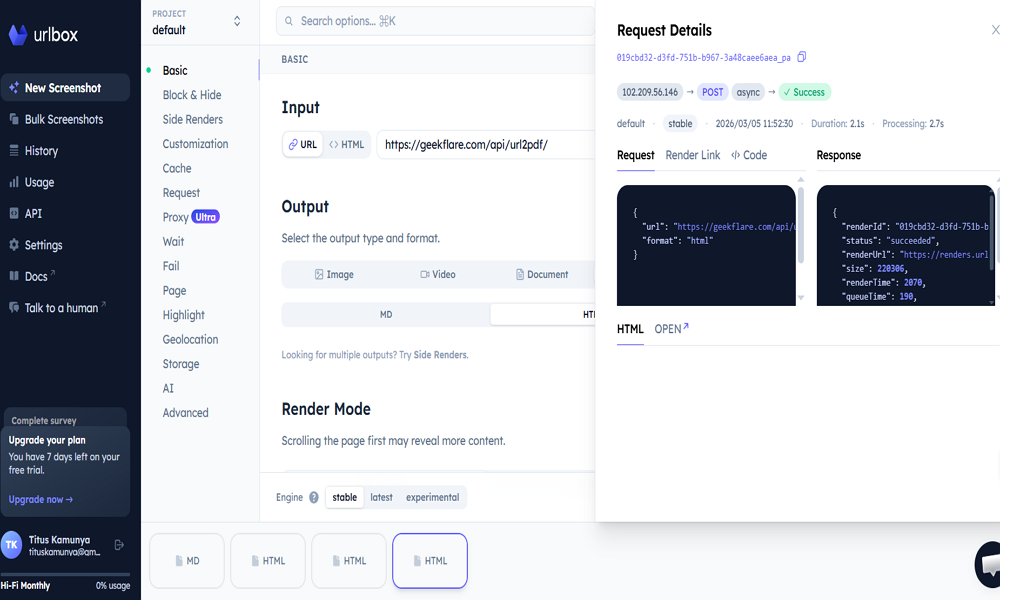 Urlbox doesn’t have a free plan, but allows users to test its features for 7 days before committing. Paid plans start at 49/month for up to 5,000 renders.