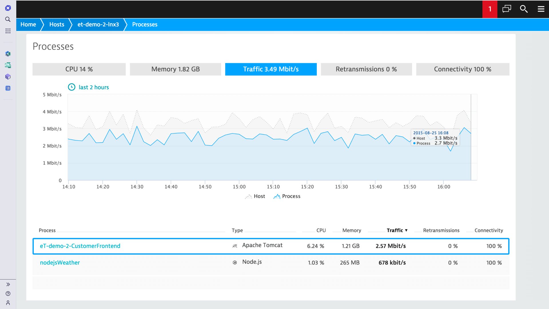 - It analyzes the quality of network between processes and hosts to spot if a server issue is due to network latency or packet loss.