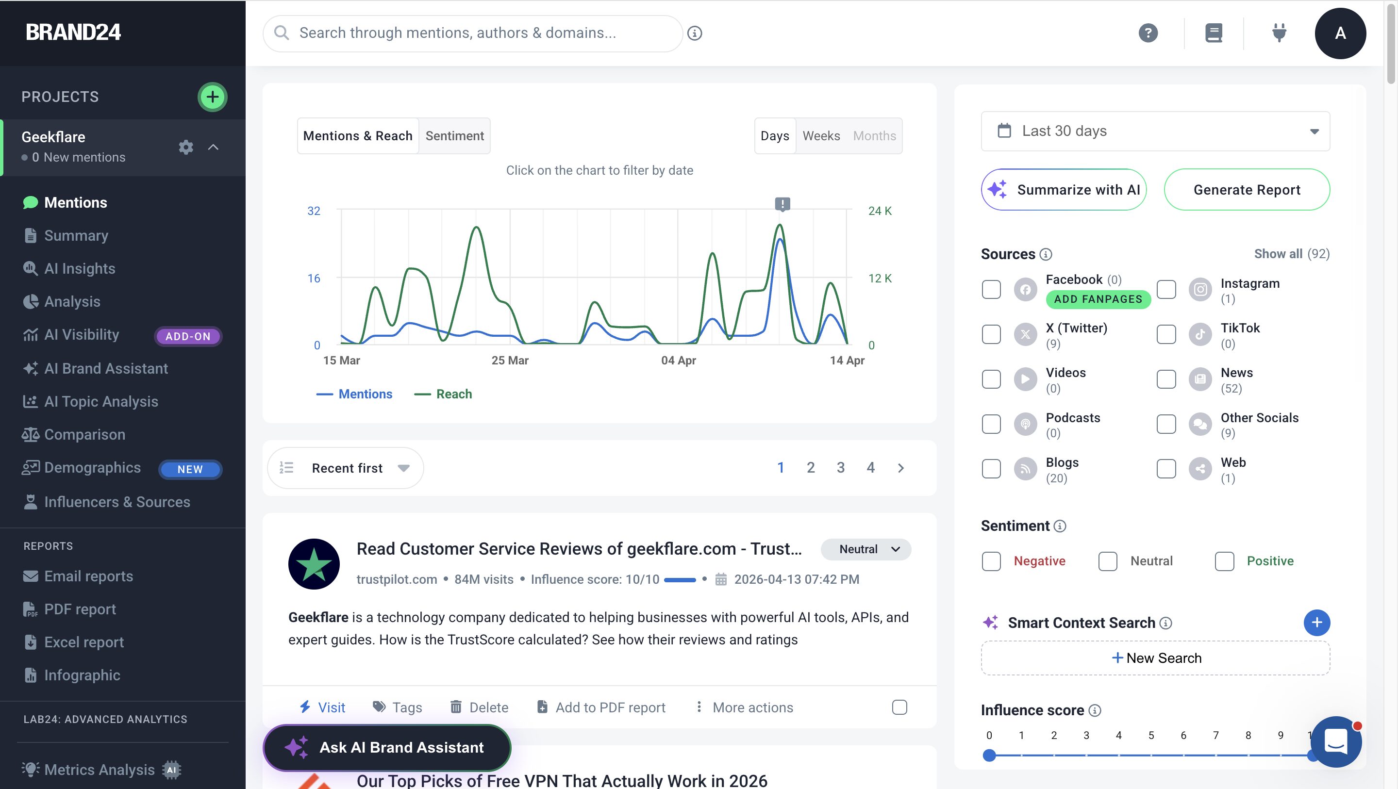 Overall, Brand24 is a strong contender when it comes to social listening tools. It offers AI-powered analysis, a large database, and advanced reporting. I recommend it to small- to medium-scale businesses that don’t need deep audience intelligence or access to dark social data.