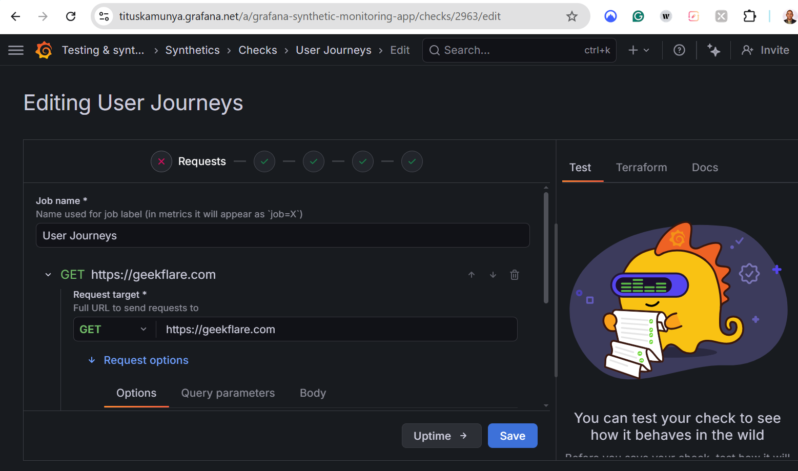 Users define tests and synthetic tests using JavaScript and the k6 API. Write your scripts just once and reuse them in your entire software development lifecycle. Use Terraform or Grafana’s API to automatically maintain and deploy checks. You can also store all the monitoring resources in your GitHub repo alongside your code.