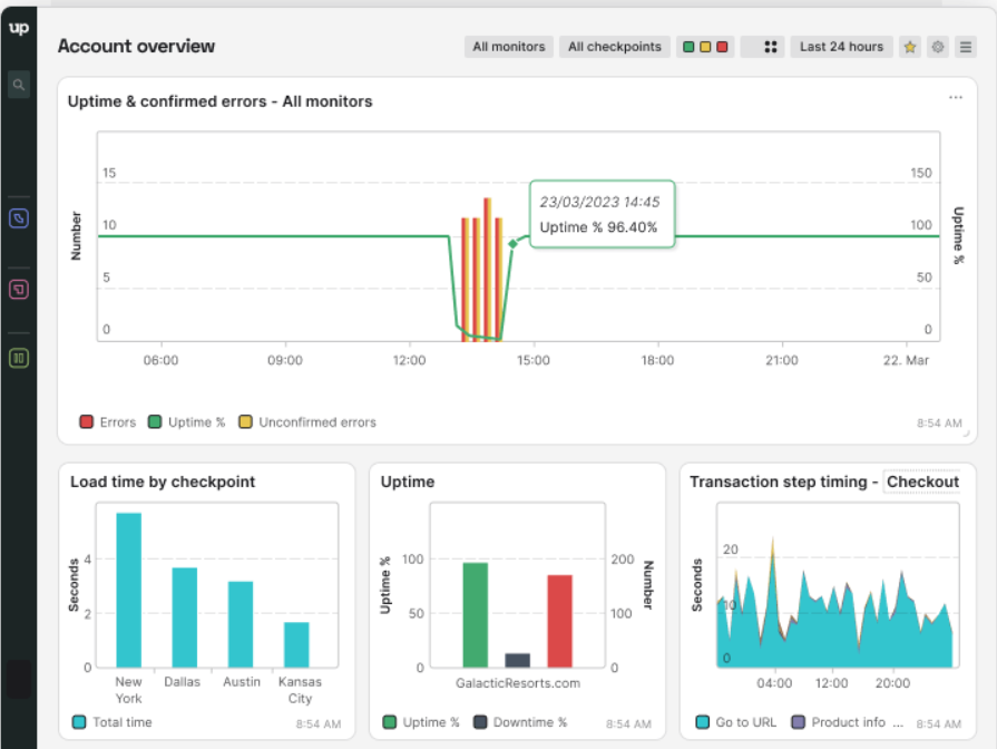 Uptrends Synthetics is a performance, functionality, and user interaction monitoring tool for web applications and APIs. This tool has over 230+ global checkpoints to record transactions such as shopping baskets, form submissions, and logins. Uptrends alerts website owners instantly when any problems arise and sometimes sends screenshots to let them know the exact issue.