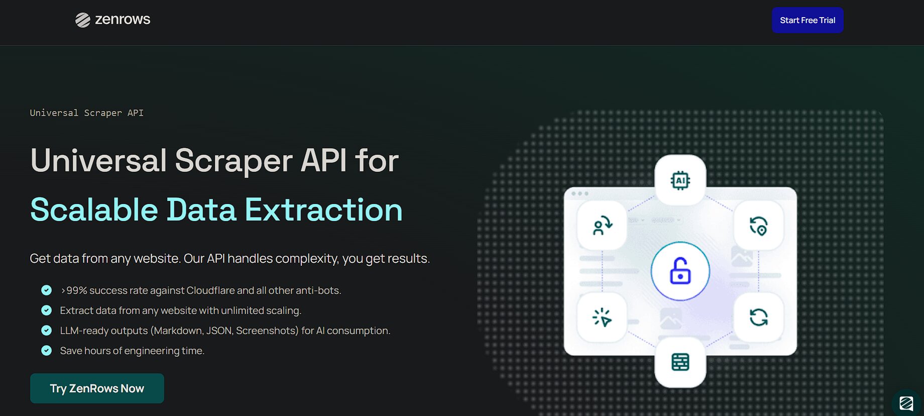 ZenRows is a commercial universal scraper API that is reliable and offers tangible ROI on data extraction. Where JavaScript generates the target content, ZenRows runs a headless browser API. Outputs from this web scraper API are HTML, JSON, Markdown, or screenshots — all optimized for downstream consumption, including by AI systems.