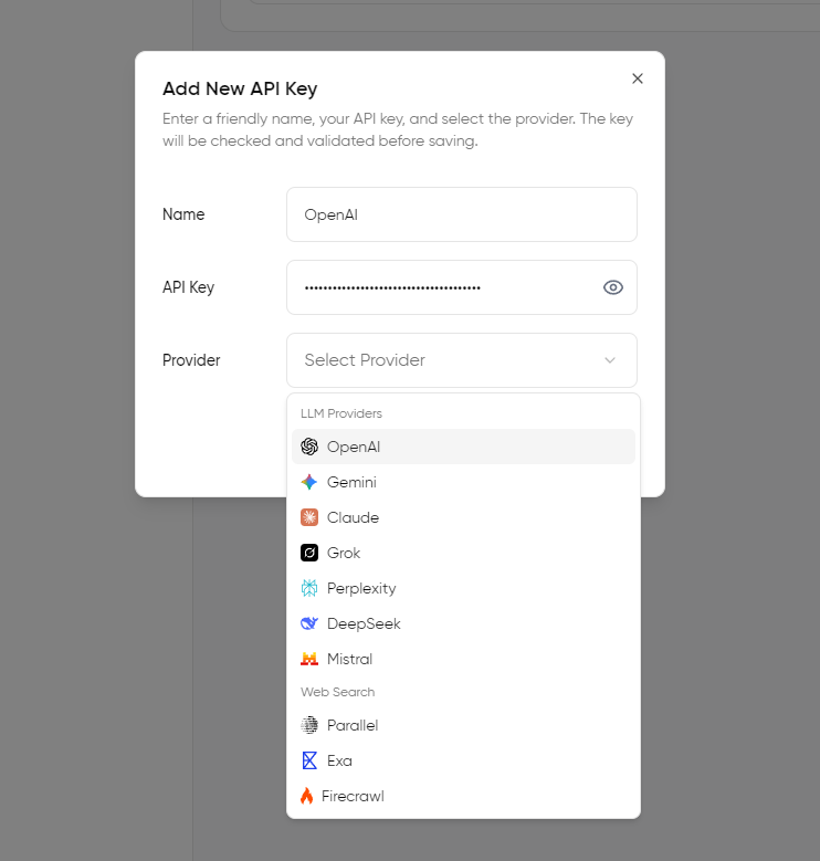 Here, you can include API keys from different vendors, including the likes of OpenAI, Google, and Anthropic, giving you the option to choose a model as per your needs.