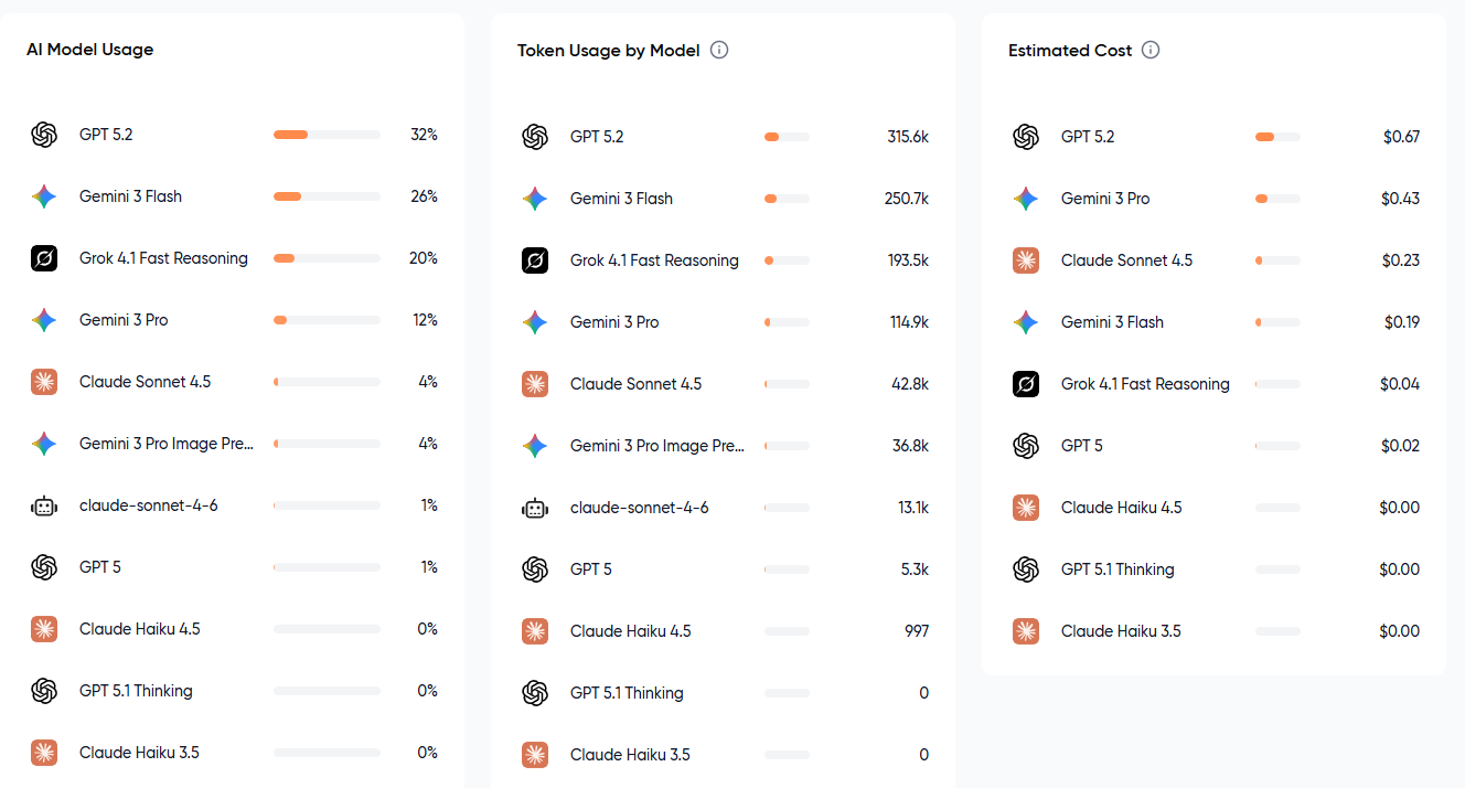 - Token Usage: Leverages 2 million “lite” LLM tokens (e.g., cost-effective models like Gemini 3 Flash Lite, Grok 4 Fast, etc.) + 2 million “pro” LLM tokens (e.g., GPT-5, Gemini 3.1 Pro for high-quality outputs).