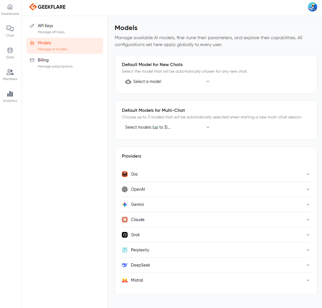 BYOK can be used for a team, which allows shared model access. For that, you need to use the Geekflare business plan that lets you add and manage team members’ access and allocation. Furthermore, you also get features such as role-based access, model management controls, and shared dashboards.