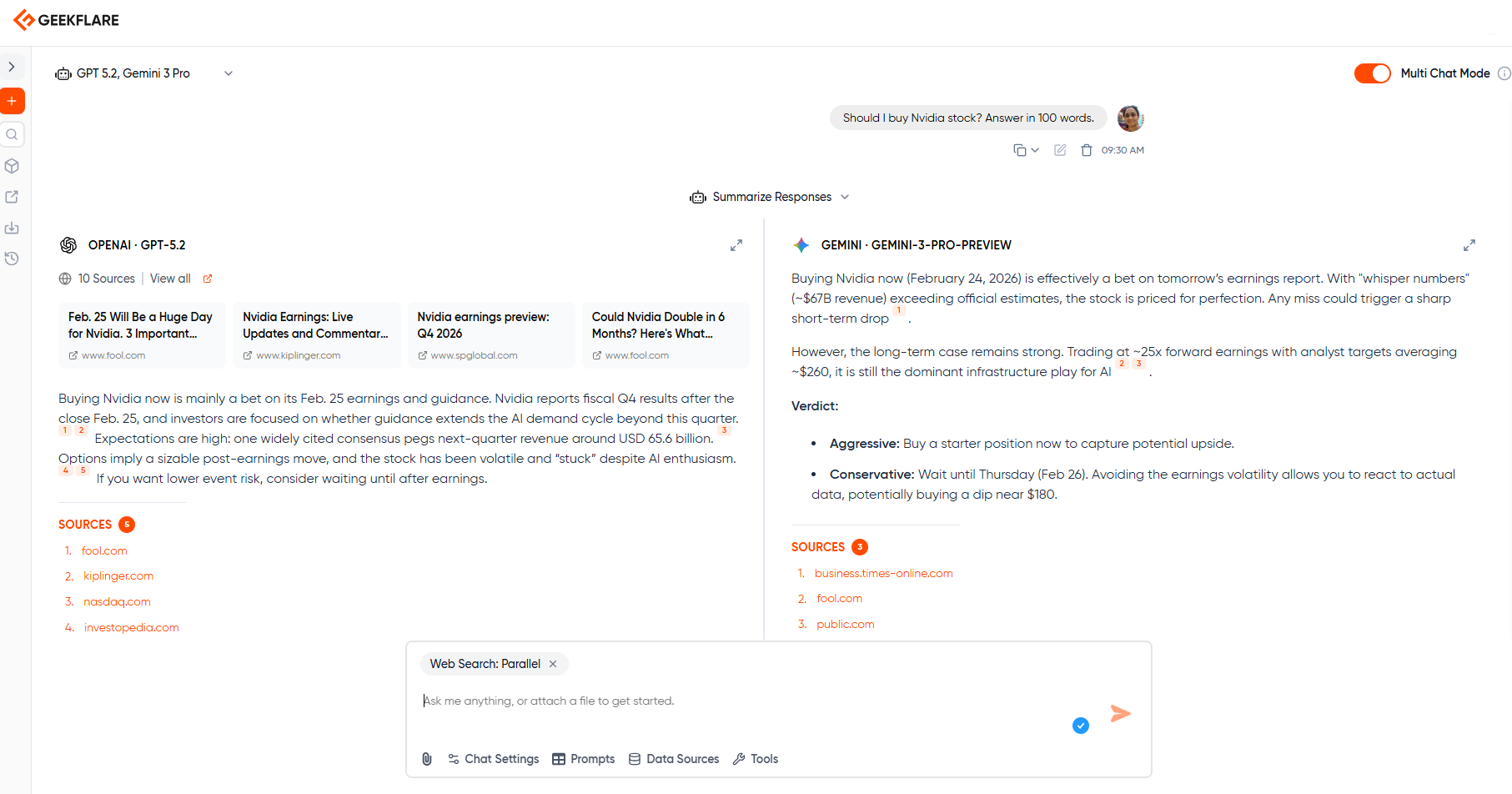 Side-by-side model comparison: Compare outputs from two models to get the best answer free from hallucinations. For example, you can run GPT against Gemini to get the best result.