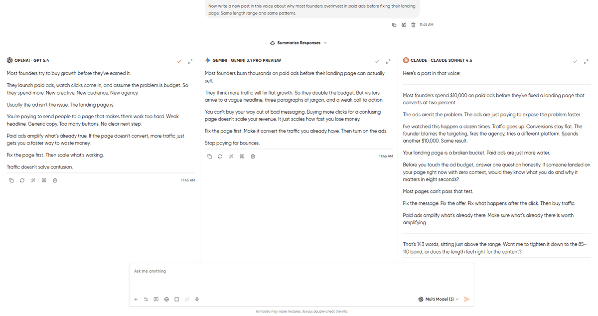 Now write a new post in this voice about why most founders overinvest in paid ads before fixing their landing page. Same length range and same patterns.Voice matching is the task where AI models are most confidently mediocre. Every model will produce something that looks like a LinkedIn post. The question is whether it sounds like this specific person’s LinkedIn post, with the proper use of voice, the commonly used phrases, and a proper structure, while also avoiding what they normally would.