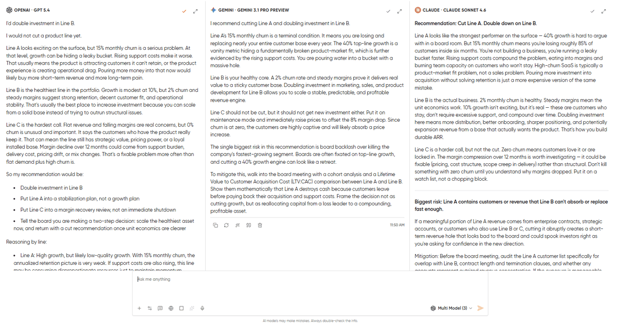 Claude 4.6 Sonnet came back with the most decisive call. Cut Line A and double down on Line B. It provides very solid reasoning: Line A’s 15% monthly churn means the entire customer base is replaced in ~6 months. So, this raises support costs and allocates the entire investment to customer acquisition. Claude also said something about Line C that no other model said: “Zero churn means customers love it or are locked in. Don’t kill something with zero churn until you understand why margins dropped. Put it on a watch list, not a chopping block.” The biggest risk it flagged was that Line A’s customers might include enterprise contracts or accounts that also use Line B, and cutting abruptly could create a short-term revenue hole right when you’re asking the board for confidence. Its mitigation: audit the Line A customer list for overlap before pulling the trigger, and consider a wind-down plan rather than an immediate cut. This is an operator’s answer, making it direct, conviction-heavy, and thinking about execution consequences.