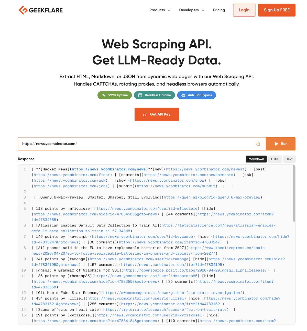 As you can see above, I’ve extracted Hacker News data. Geekflare API allows you to extract the visual data from any webpage in a structured format and also handle technical stuff like CAPTCHAs, rotating proxies, and headless browser rendering.