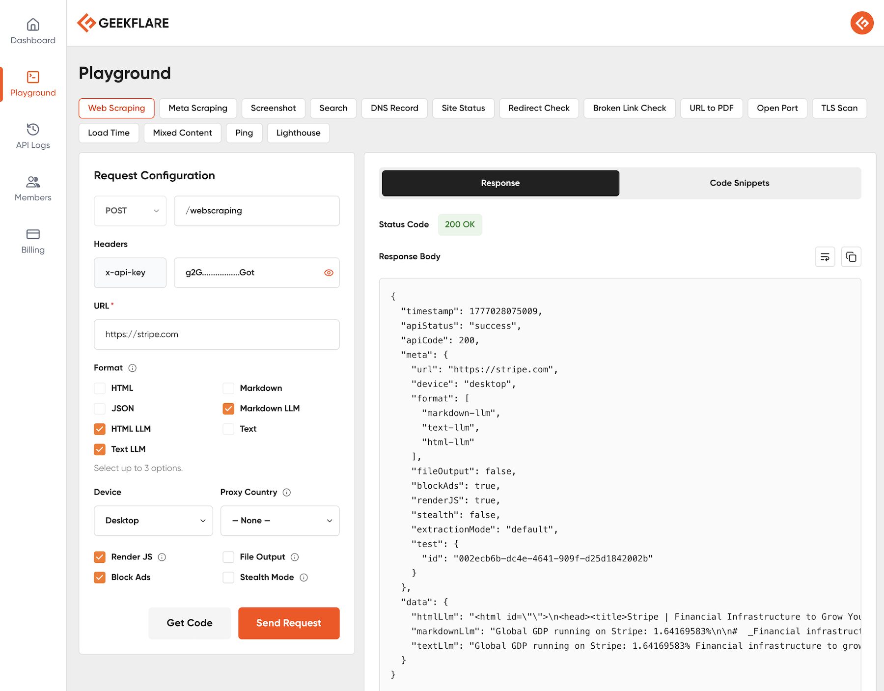 The API Playground is a no-code, visual interface for exploring every API in the Geekflare suite, including Web Scraping, Search, and Screenshot APIs. You can configure requests, send them in real time, inspect the responses, and grab ready-to-use code snippets, all from one screen.